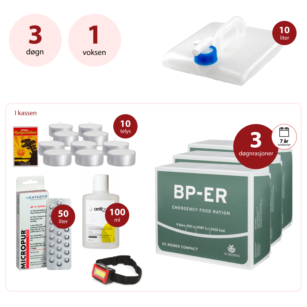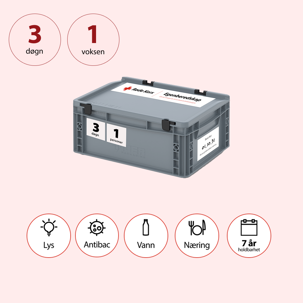 Denne pakken er en tilleggskasse rettet mot de som allerede har en del på plass eller for de som ønsker et utgangspunkt til egenberedskap å bygge videre på. Innholdet er det mest grunnleggende for en person i tre dager: